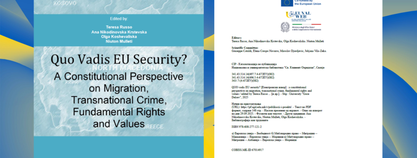 We are proud to announce the launch of our latest scientific outcome with the publication of the book, edited by Teresa Russo, Ana Nikodinovska Krstevska, Olga Koshevaliska, Niuton Mullet, “Quo Vadis EU Security? A Constitutional Perspectives on Migration, Transnational Crime, and Fundamental Rights and Values”, as part of the Third Edition of the Jean Monnet Chair “Promoting Public Awareness on Enlargement, EU Values, and the Western Balkans’ Accession” (EUVALWEB).