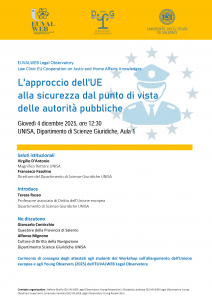 On Thursday 4 December 2025, at 12.30 pm – in Room 1 of the Department of Legal Sciences (DSG) of the University of Salerno – the Seminar entitled “The EU approach to security from the point of view of public authorities” will be held. The Seminar is part of the activities of the EU Legal Clinic Cooperation on Justice and Home Affairs: Knowledges and the EUVALWEB Legal Observatory (DSG UNISA), aimed at promoting specialized and professionalizing training for students, involving academics, professionals and representatives of the Authorities.
