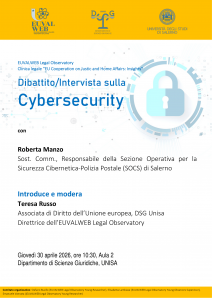 On Thursday, April 30, 2026, at 10:30 a.m., the debate/interview on “Cybersecurity” will take place in Aula 2 of the Department of Legal Sciences at the University of Salerno. The event is organized by the EUVALWEB Legal Observatory within the framework of the legal clinic “EU Cooperation on Justice and Home Affairs: Insights.”