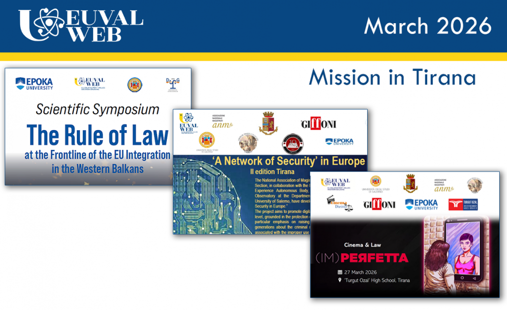The EUVALWEB Legal Observatory at the Department of Legal Sciences of the University of Salerno arrived to Tirana, Albania, with the project “A Network of Safety in Europe” – Second Edition, carried out in collaboration with the National Magistrates Association – District of Salerno, the State Police, the autonomous body Giffoni Experience, and the Bar Association of Salerno. The project includes a series of initiatives involving academics, professionals, university and school students, and Albanian civil society.