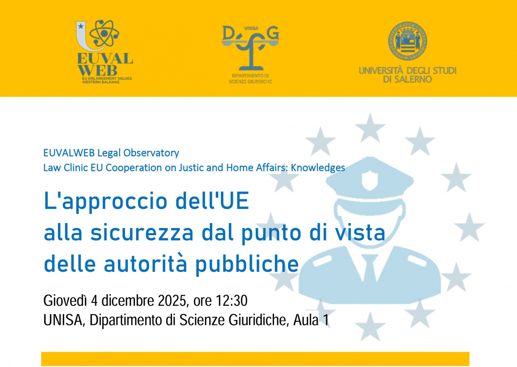 On Thursday 4 December 2025, at 12.30 pm – in Room 1 of the Department of Legal Sciences (DSG) of the University of Salerno – the Seminar entitled “The EU approach to security from the point of view of public authorities” will be held. The Seminar is part of the activities of the EU Legal Clinic Cooperation on Justice and Home Affairs: Knowledges and the EUVALWEB Legal Observatory (DSG UNISA), aimed at promoting specialized and professionalizing training for students, involving academics, professionals and representatives of the Authorities.